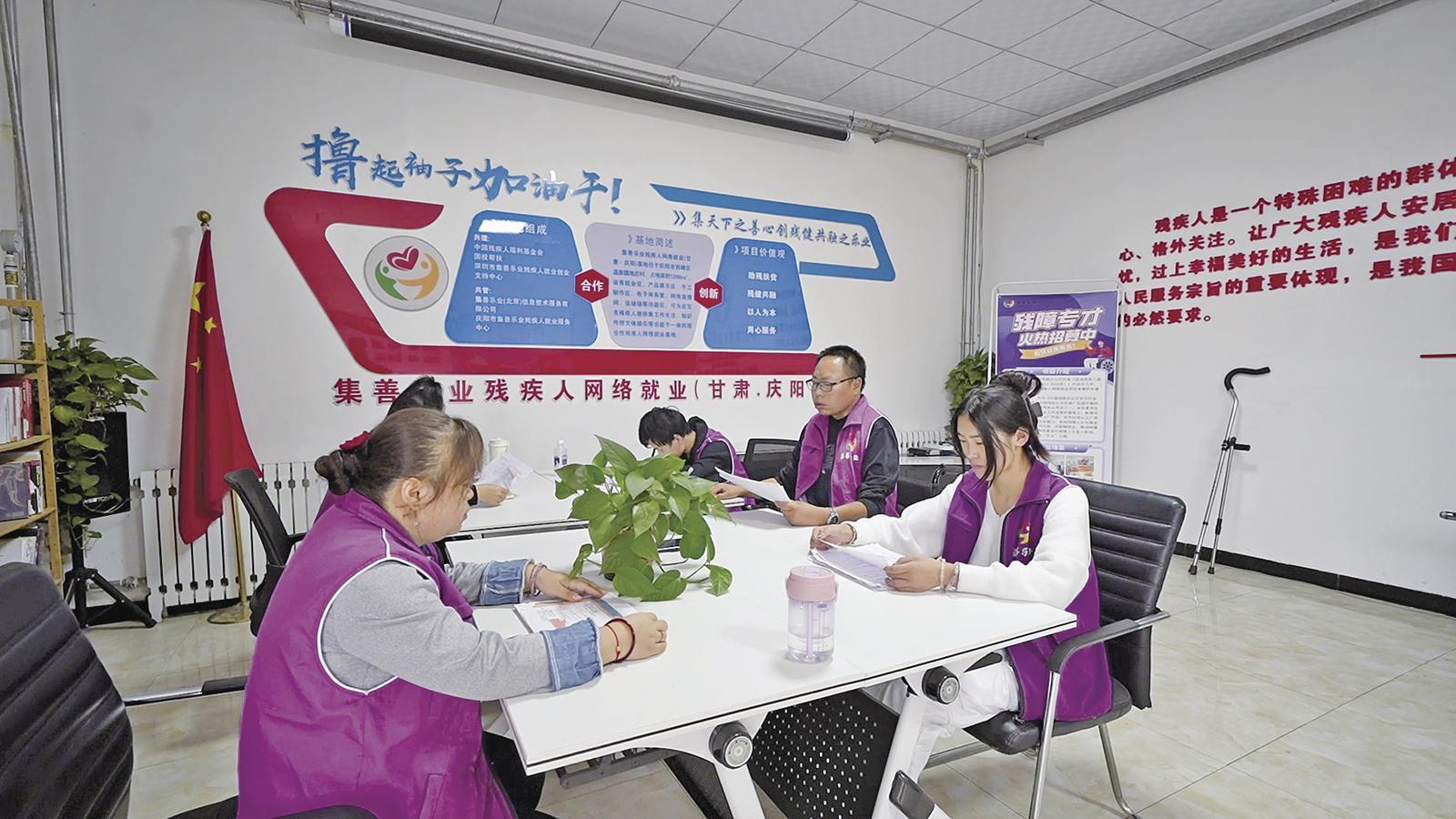 2020年6月,李含林在網(wǎng)上看到了張掖市建立集善樂(lè)業(yè)殘疾人網(wǎng)絡(luò)就業(yè)基地的消息,這讓他眼前一亮——如果能把這個(gè)項(xiàng)目引進(jìn)來(lái),孩子們還愁沒(méi)有工作嗎?通過(guò)張掖基地,李含林與中國(guó)殘疾人福利基金會(huì)總部取得聯(lián)系。在各級(jí)殘聯(lián)的幫助下,他通過(guò)了各項(xiàng)考核,2020年12月,慶陽(yáng)集善樂(lè)業(yè)殘疾人網(wǎng)絡(luò)就業(yè)基地建成,京東話務(wù)慶陽(yáng)培訓(xùn)班和申通話務(wù)客服、在線客服等項(xiàng)目陸續(xù)在這里運(yùn)營(yíng),越來(lái)越多的殘疾人來(lái)到這里,他們不僅學(xué)到了賴(lài)以生存的技能,更收獲了尊重、關(guān)愛(ài)與自信。