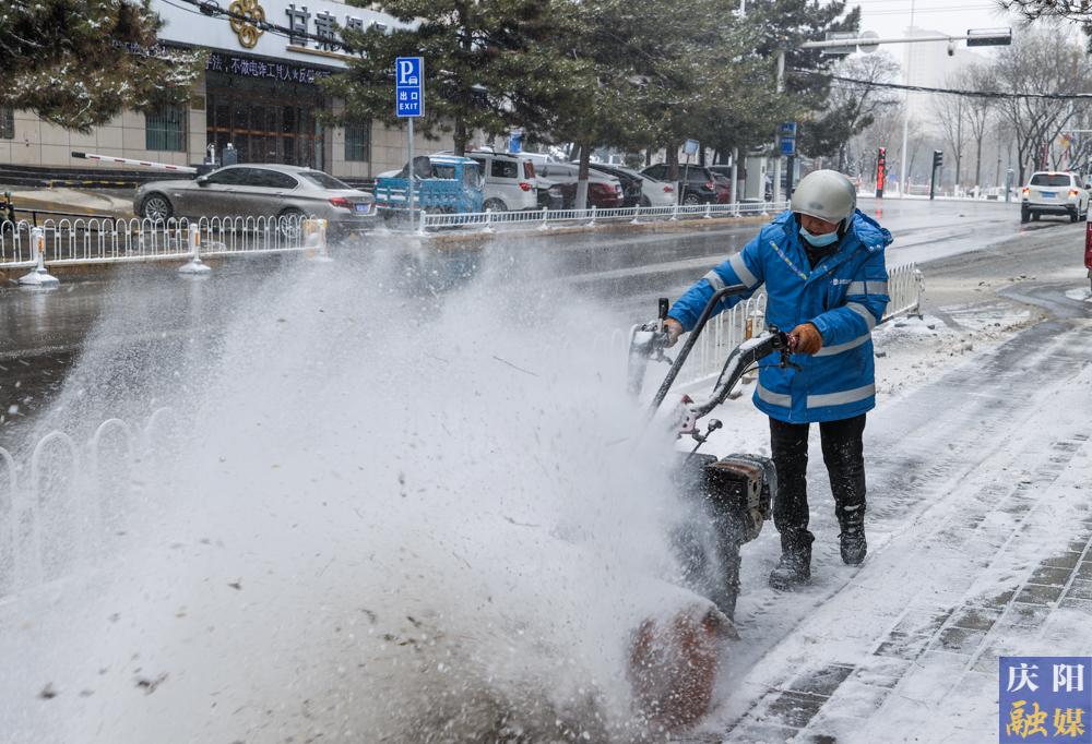 弘化西路環(huán)衛(wèi)工人正在清理路邊積雪。